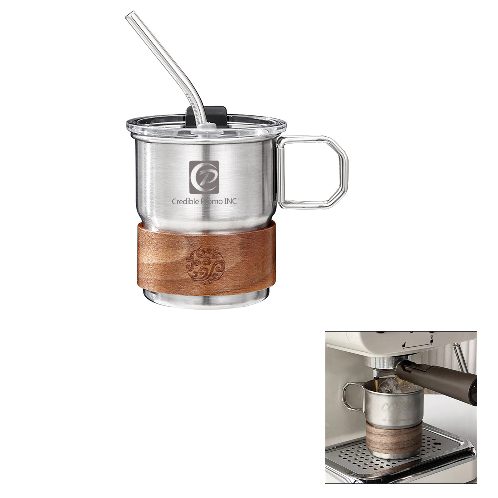 10oz Stainless Steel Coffee Cup Set With Wooden Holder And Handle