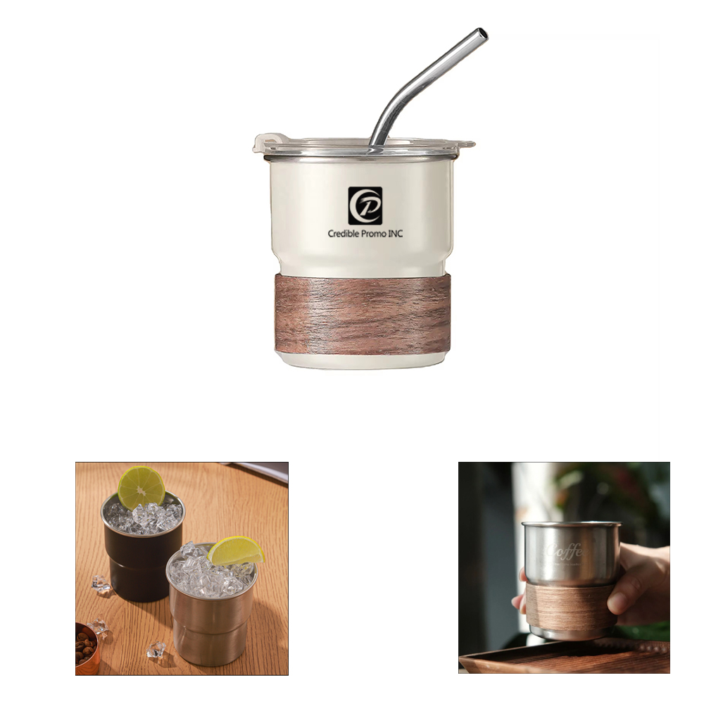 10oz Stainless Steel Coffee Cup With Lid Straw And Wooden Holder