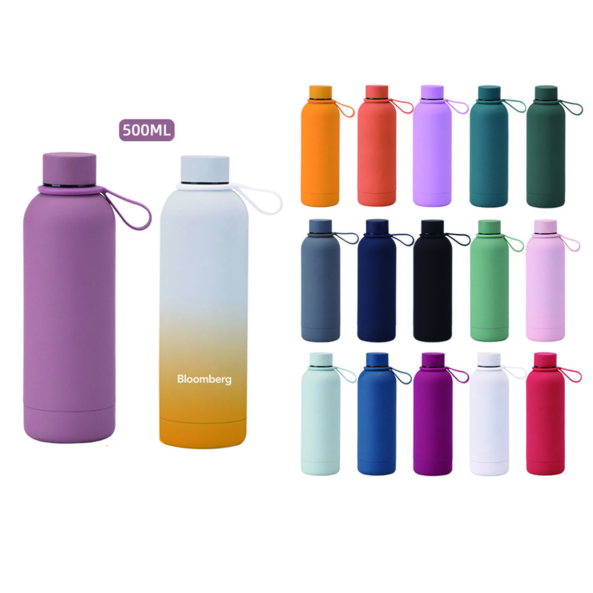 Refillable stainless steel bottle ideal for sports, hiking, travelling and more. Double walled vacuum insulation keeps your drinks hot for 6 hours or cool for 12 hours. Sleek and stylish design, with leak-proof screw top lid. Capacity: 500ml, 350ml, 750ml and 1000ml are also available. Bottle can be gradient colors.