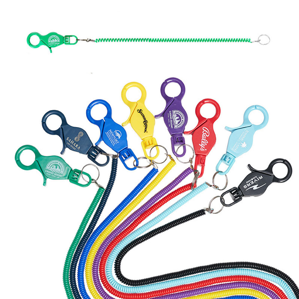 Casino coil cords with lobster claw is made from EVA and PP plastic. It is prefect to keep cards from being lost. We will make virtual proof according to your request. Our price includes one side logo, please contact us if you need double side logo. Coil stretches to over 60" long. There are several styles, and our website prices are based on the style pictured on the cover.