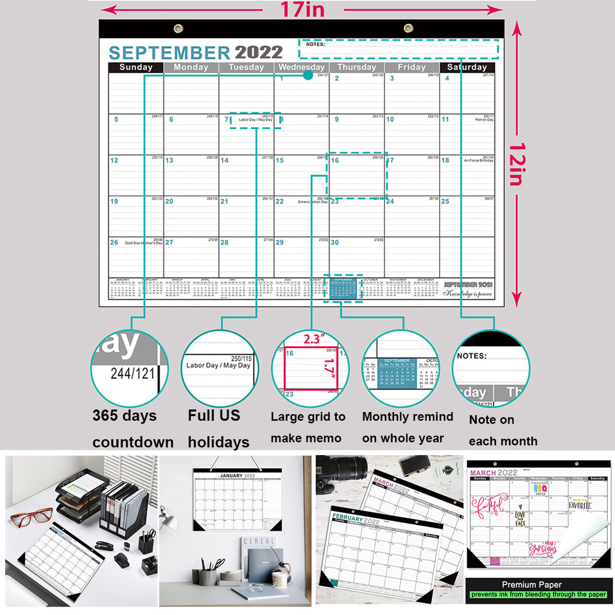 | Feature : | 2022 Wall Calendar Or Monthly Desk Pad Large Size 17"x12 With Large Blocks, Perfect for Home Office Easy Planning |