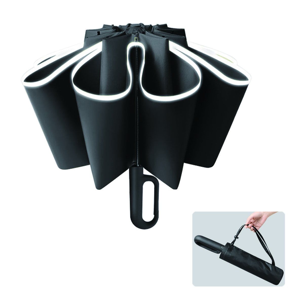 Umbrella have achieved the maximum UPF rating achievable: UPF 50+, means that effectively blocking 99% ultraviolet radiation even when the sun is strong. By adopting a reflective safety strip structure, it attracts attention even at night walk and improves safety. The unique buckle handle allows for easy hanging on backpacks, belts, and more. The 10 DOUBLE ribs are made of the black aluminum alloy, which is light, robust and does not rust, making the ribs of the umbrella resistant to bending and resisting strong winds. Folding design, easy to carry. The rainy surface will be inside when the umbrella is closed, so you won't have to worry about getting wet.