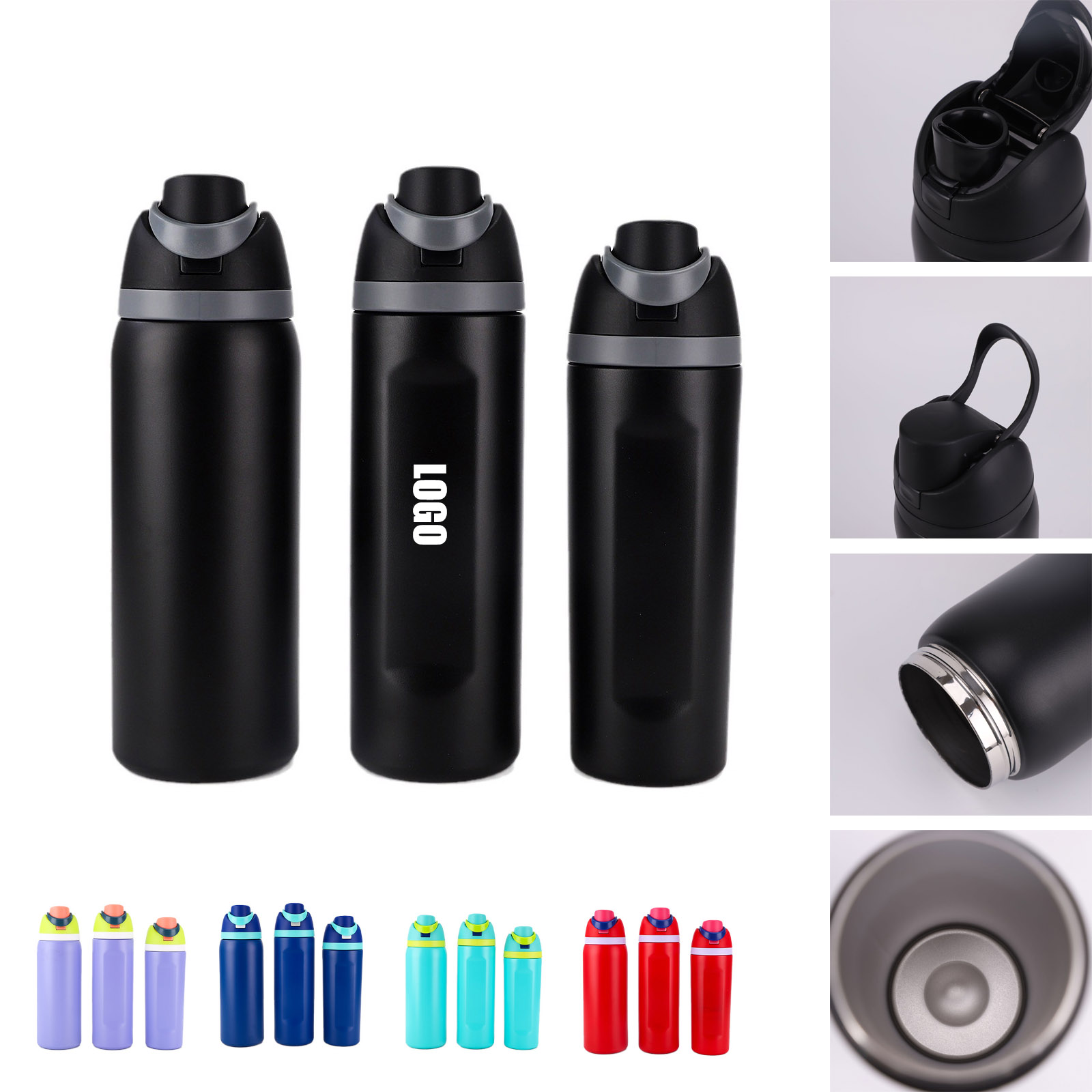24oz insulated stainless-steel water bottle with a two way drinking spout and push-button lid with lock. The spout designed for either sipping upright through the built-in straw or tilting back to swig from the spout opening. Protective push-to-open lid keeps spout clean, convenient carry loop doubles as a lock. Custom logo and custom color bottle is available. Laser engraved, silksreen or full color logo. Price is based on laser logo and silksreen logo. We also have different valume for choice. Welcome to inquiry us for details!