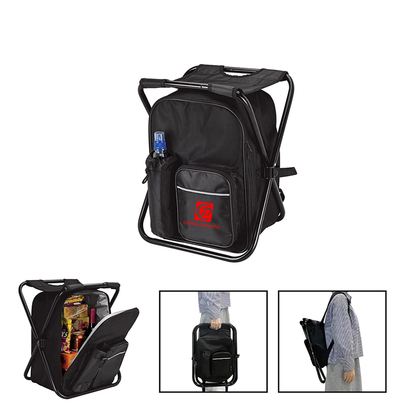 It is made of durable 600D material and features a zippered main compartment with PEVA lining, adjustable padded shoulder straps, zippered front pocket, and a water bottle pocket. Suggested max weight for chair is 300 lbs. Folds flat for easy storage.