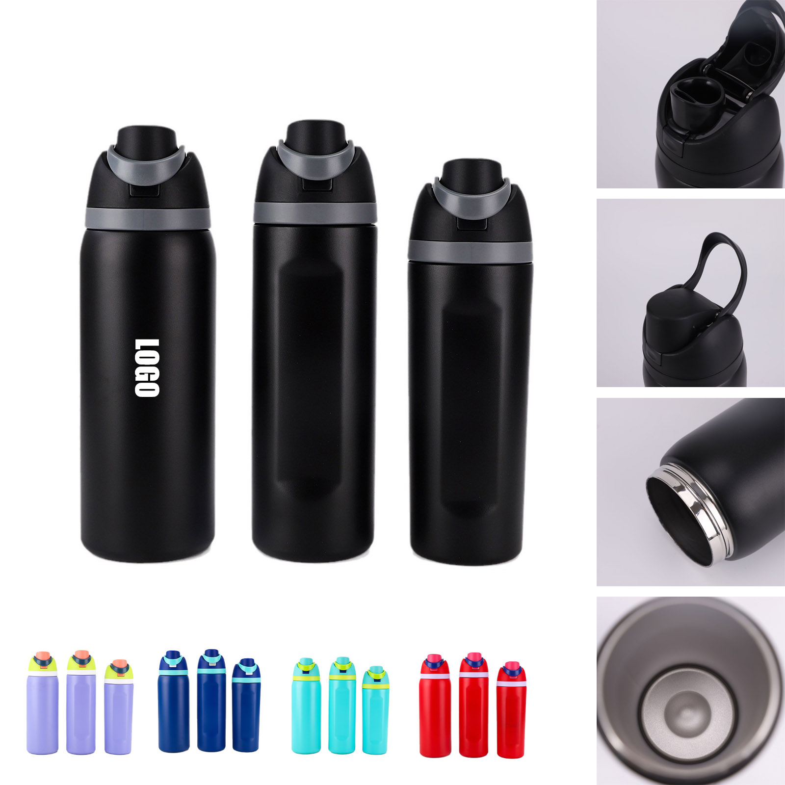 32oz insulated stainless-steel water bottle with a two way drinking spout and push-button lid with lock. The spout designed for either sipping upright through the built-in straw or tilting back to swig from the spout opening. Protective push-to-open lid keeps spout clean, convenient carry loop doubles as a lock. Custom logo and custom color bottle is available. Laser engraved, silksreen or full color logo. Price is based on laser logo and silksreen logo. We also have different valume for choice. Welcome to inquiry us for details!