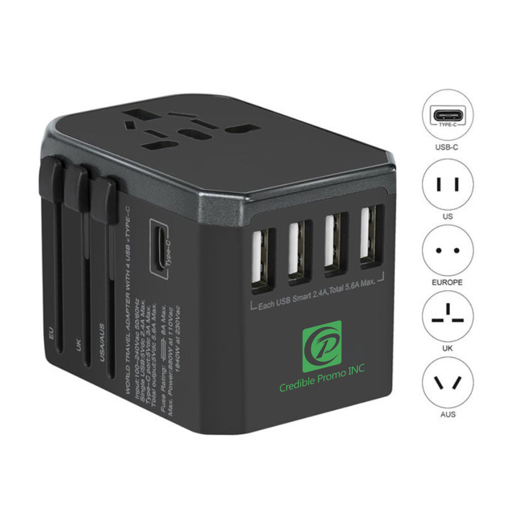 This all-in-one travel plug adapter integrates 4 retractable plugs (US, EU, UK, AU) and USB ports, which are available in 200+ countries. Built-in auto-resetting fuse to protect against overload or short circuit. Support simultaneous charging of multiple devices such as cell phones and table PCs. Ergonomic design suitable for one-handed operation. Perfect promotions with your LOGO.