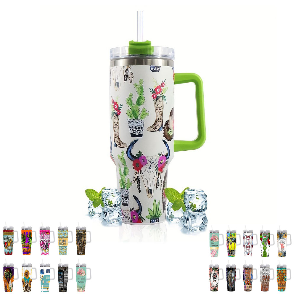 Wherever you go, take this 40 OZ insulated travel mug along with you, to enjoy your favorite drinking! Your vivid artwork can be full color UV imprinted on the generous imprint area, widely expose your company logo. Made from double wall stainless steel construction, keep drinks cold up to 11 hours & hot up to 7 hours. Screw-on clear straw lid with seal and a twist closure, come with strong and durable handle, reusable straw included. Fits most car cup holders (3" base diameter).