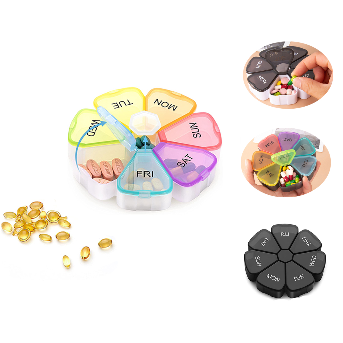 Our pill box is made of 100% food grade material, safe to keep your daily medication. BPA free.The 4.7 inches diameter pill box is big enough for your weekly dose of medicine. Every compartment can hold up to 8 fish oils/14 capsules. Flower compact size is perfect for you on-the-go. It will stay closed once locked and securely snap will keep your pills safe. Bigger mark of the date of a week makes it easier for you to distinguish, 7 different colors of covers to avoid confusion.