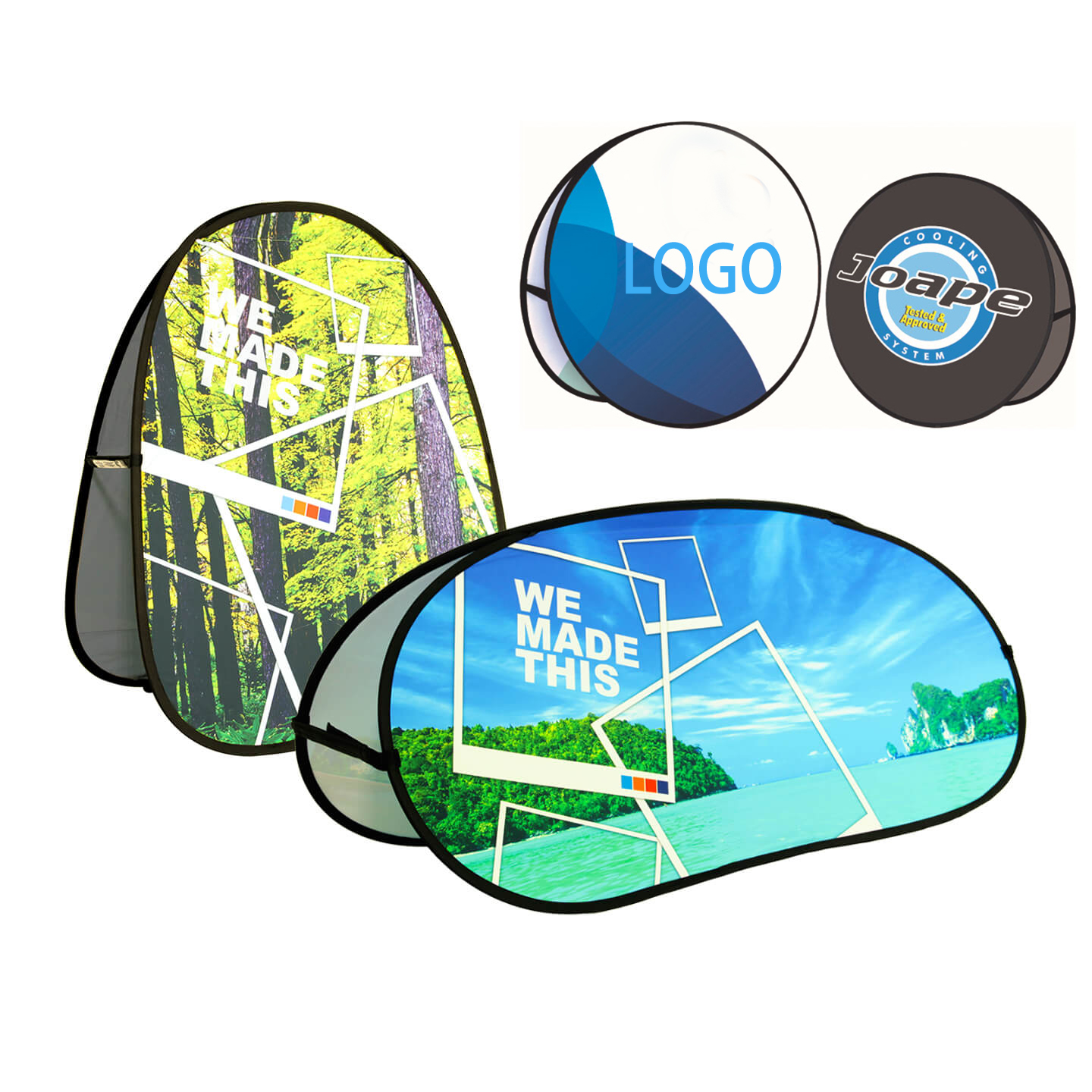 Pop up signs are frequently used as directional signage at these events, as well at outdoor festivals, concerts, fairs, and trade shows. Come with a high quality polyester sleeve that takes just seconds to install. The graphic can be screen printed or sublimated, depending on the desired art effect. We have options of being displayed with a vertical or horizontal orientation, in virtually unlimited layout/sizing options. These incredible banners instantly spring into shape, utilizing EZ Twist technology, which also allows them to fold up neatly and very compact for easy transportation or storage. You can custom shape and size, and the MOQ is 2pcs. Welcome to inquiry us!