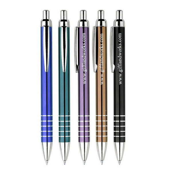 High quality ballpoint pen, made from aluminum pen body and plastic silver plated trims. Laser engraved grip. Your LOGO can be laser engraved or silk screen imprinted on the pen body. Many colors for your option.