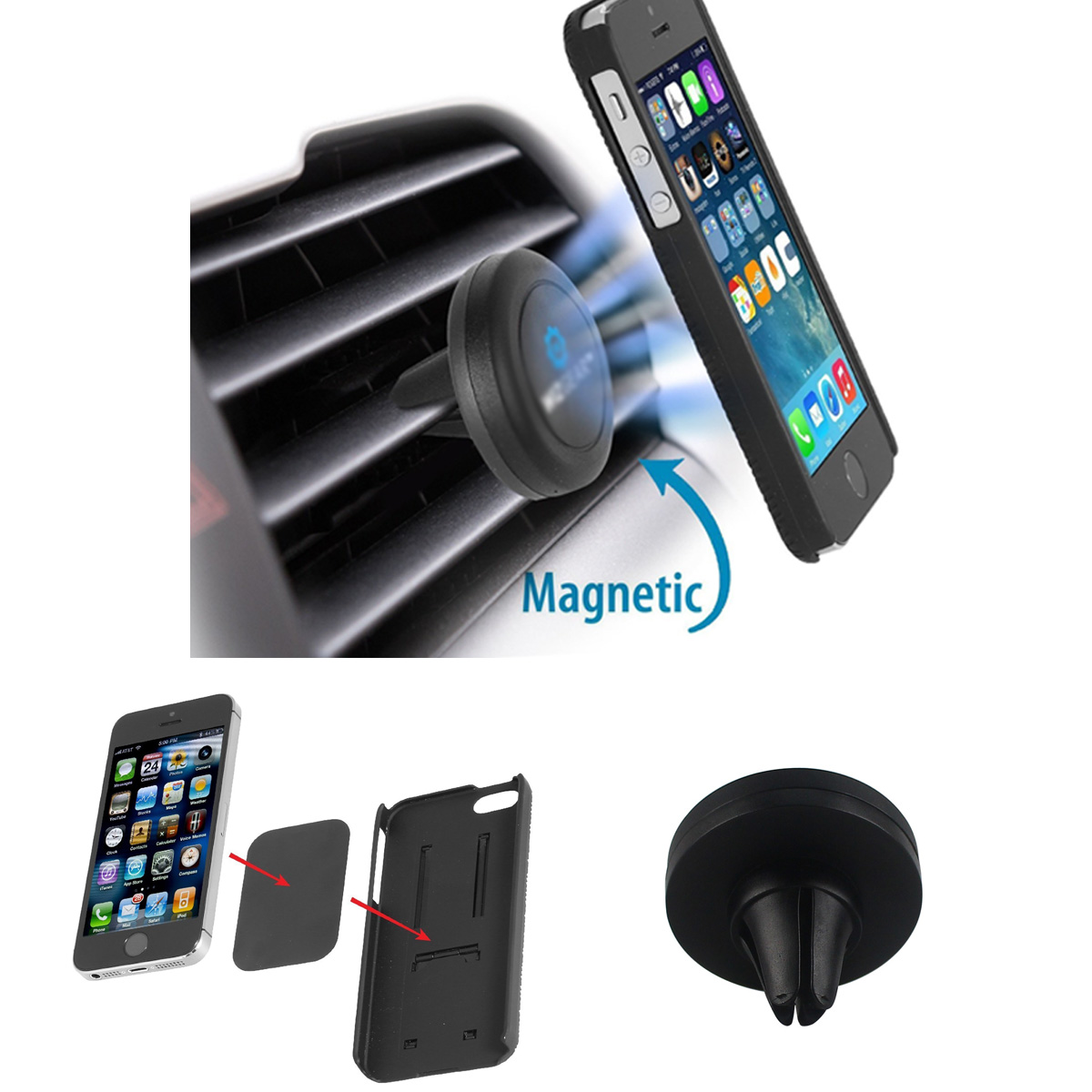 This universal magnetic holder produces an intensive force of attraction that will hold any smartphone. Rotate your smartphone and swivel your display as you please. The base of the mount remains fixed into the air vent of your car and does not move. This guarantees that your smartphone will always remain in your preferred position. The magnetic mount is one that fits into the back of any smartphone. It has a sturdy rubber base and a powerful magnetic head for holding smartphones.
