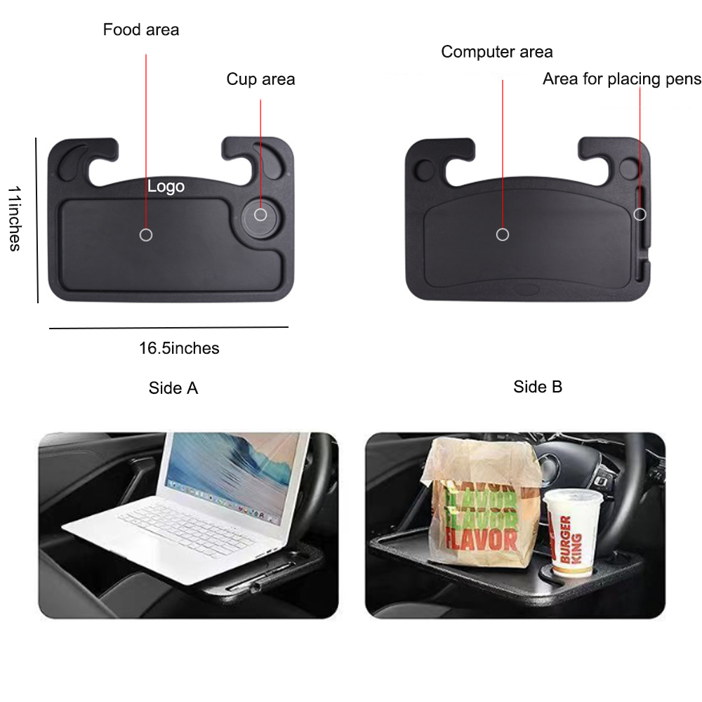 The front side of the tray table has a cup holder for cups and drinks, and a concave surface on the front to prevent food from slipping off. The reverse side is a flat surface with a pen slot for office writing and reading books. You can easily write on it or put your laptop and don't worry about losing your pen. Fits steering wheels with circumference ​between 4.06''- 4.33''.