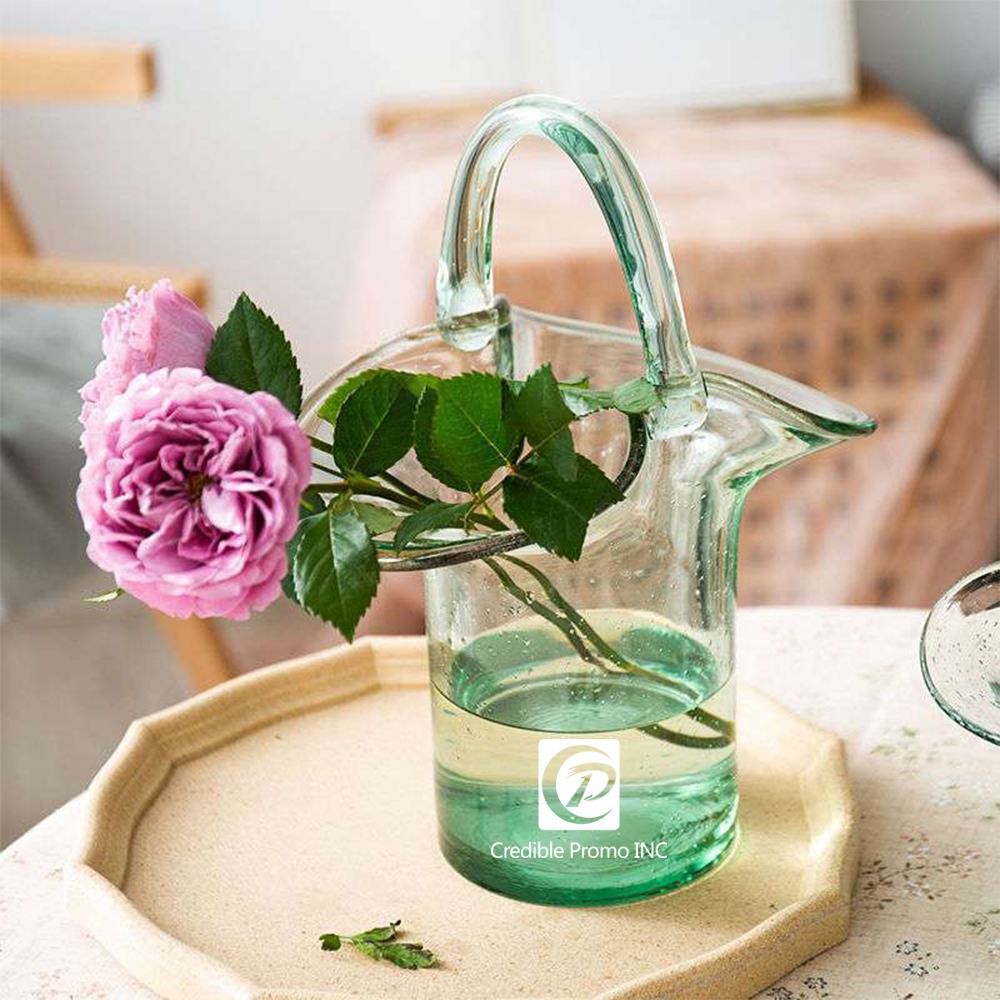 Made from heavy duty sturdy glass. Clear hand blown glass vase in flower basket shape, 12.2''x9.4"x7", polished flat bottom for stable standing, the handle sturdily fixed on the vase body, little air bubbles scattered evenly as a feature of handblown glass vase art, all pieces are carefully handmade by skilled craftmen. Great as a centerpiece, with or without flower, great for wedding, parties, hotels, bars, restaurants, cafes as a table decor, also can be used as a candy container, gift container, coin bank jar, fish tank.