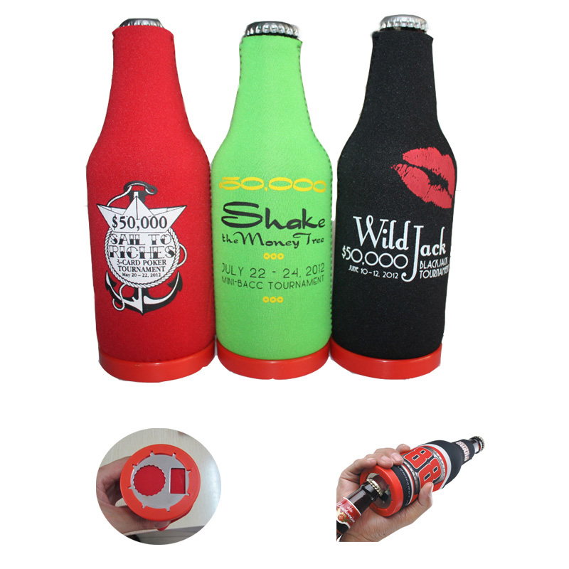 Bottle Cooler with Opener. Thie Bottle Cooler is made from Neoprene Material. Keep your beverage cool for a long time. It's convenient to open the bottle with the bottom opener. Many colors and any LOGO is available.