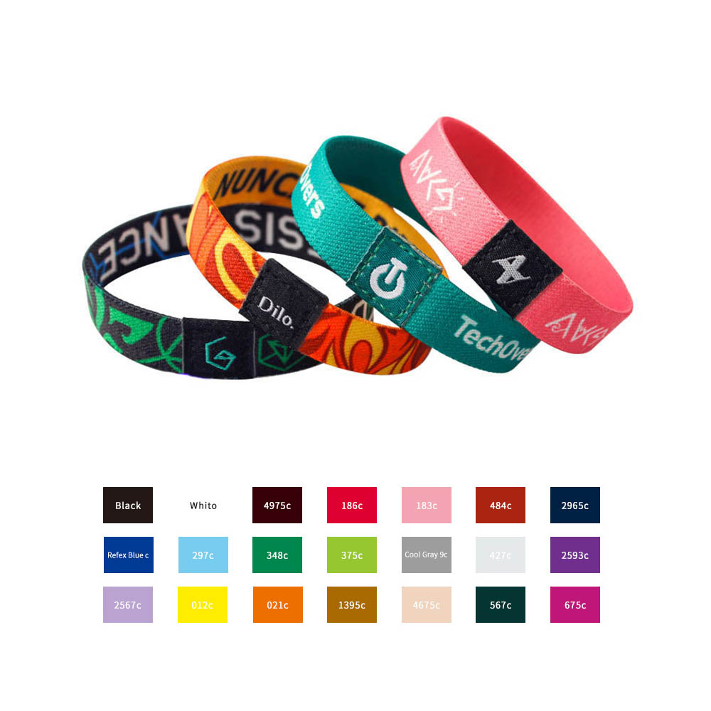 This elastic fabric wristband is made of flexible and soft polyester with customized woven label. Available with printing full color designs on both sides, makes your company design attractive and fashionable. Ideal for events, theme parks, meetings, trade shows, music festivals, identification, team building, parties and other public places. Different size for your option: width 1/2", width 5/8", width 3/4", width 1", our listed price is based on width 5/8", welcome to inquiry us for other size.