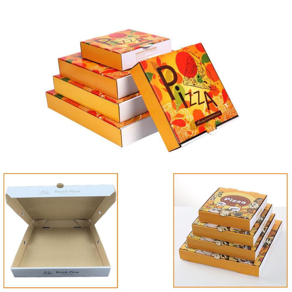 Our pizza box is made from food grade corrugated carton and white cardboard, full color imprinting with your design acts as a billboard promoting your business. This box is not only great for pizzas, but for cookie cakes, pies and other large food treats. Our listed price is based on size 12", we also have 6", 7", 8", 9", 10" size available, and we can customize other shapes, such as: triangle, hexagon, etc. Shipped in unfolded flat packing. Welcome to inquiry us!