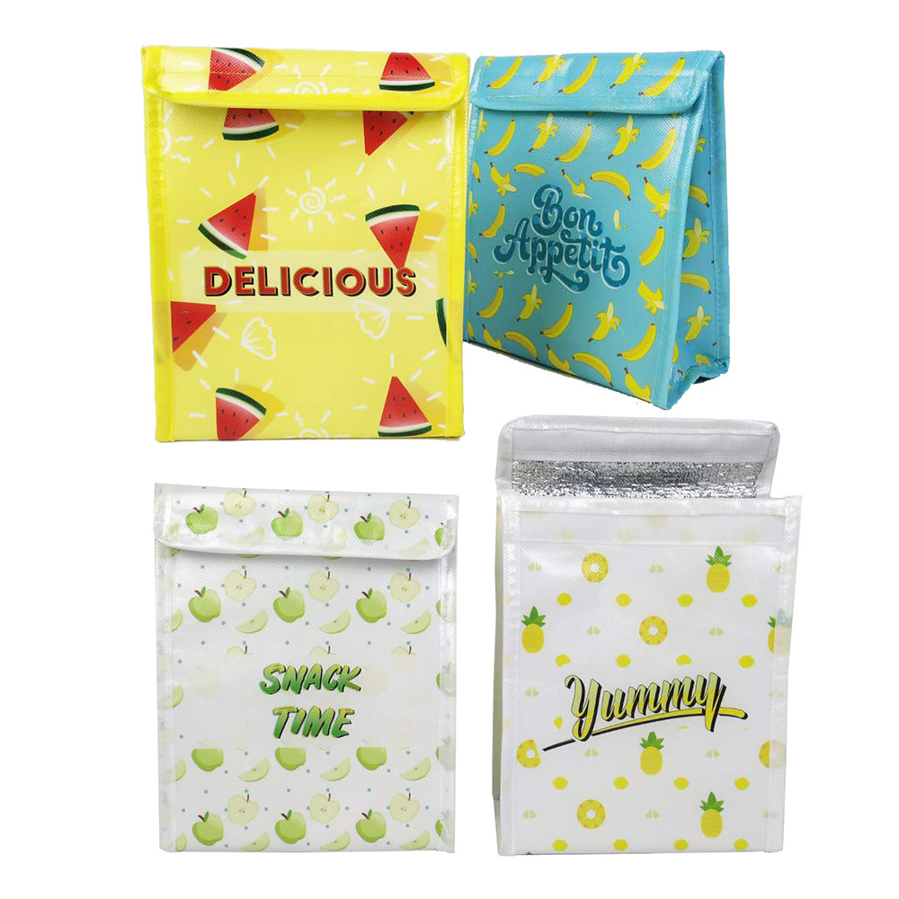 Custom full color imprint thermal flip flap type lunch cooler bag, insulated liner inside. Portable and foldable. Made from 80gsm non-woven material. Measuring H10 1/4" x W7 7/8" x G4", this cooler features flip flap design, top velcro closure with an easy access the main compartment. Have your full color design warp imprinted on the surface for brand exposure! Our listed price is based on lunch bag size, custom other size is available. Welcome to inquiry us for custom other size and design.