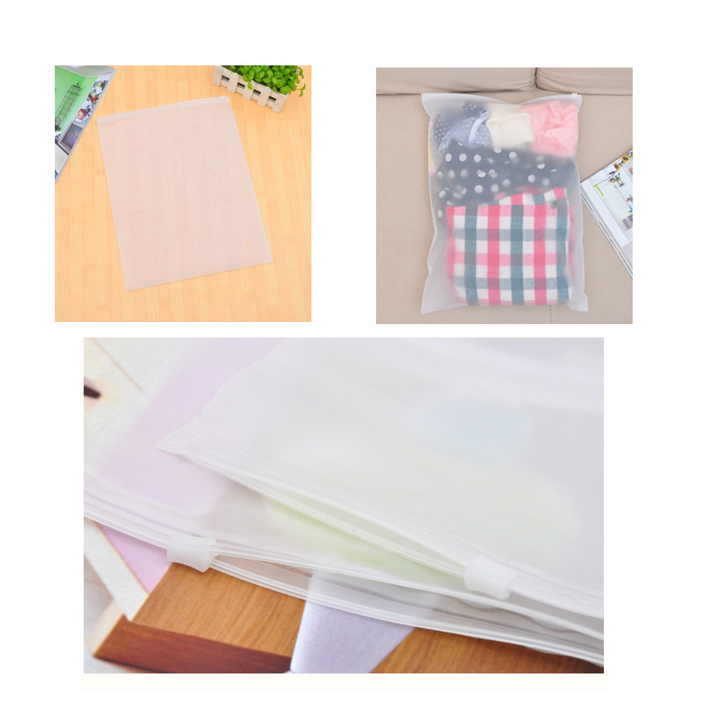 Matte frosted travel pouch storage waterproof ziplock seal bag organizer. Perfect for storing clothes, documents, photos, cosmetics, wash supplies and other items. ideal for your travel and household storage. Made from PE. This price bases on our size 15.7"x 11.8". If you want to custom your size, welcome to contact us for more details.