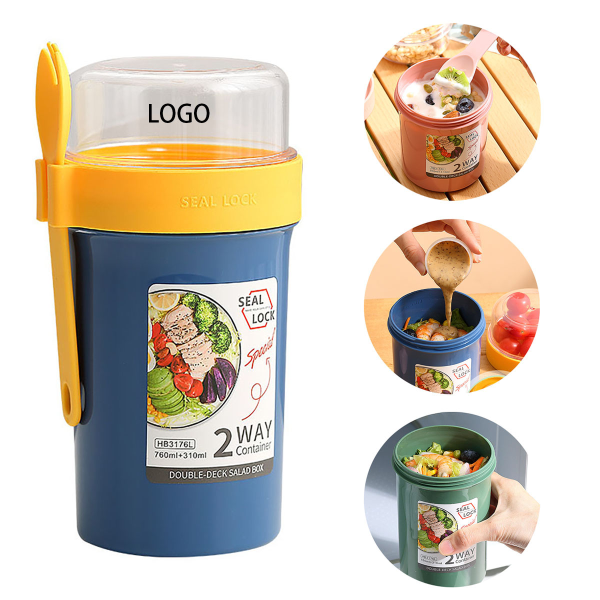 Our cereal on the go cup for breakfast made of food-grade PP, have excellent tightness and leak-proof properties. It is compact and lightweight, easy carrying, comfortable to hold, you can also put it in handbag, allowing you to fresh salad meal anywhere. It is designed with double layers 760ML+230ML, upper fruit cup, lower salad cup, with salad dip box and fork. Ideal for families, bars, restaurants, travel and camping.