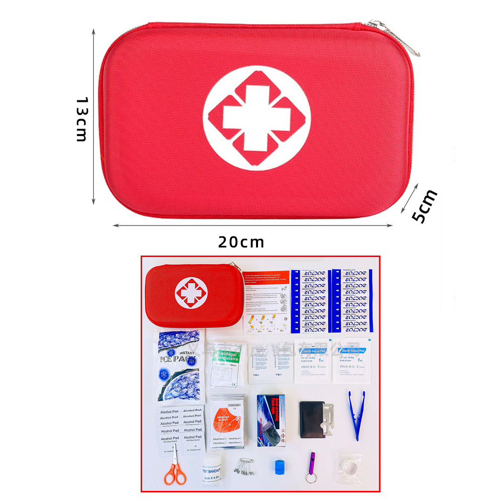 This first aid kit comes with a portable shockproof EVA foam zipper pouch, including: 10 pcs bandages, 1 emergency manual, 10 pcs alcohol pads, 1 PBT elastic bandage, 1 bandage triangulaire, 1 emergency blanket, 2 pcs gauze swabs, 2 pcs wet wipes, 2 pcs prep pads, 1 scissors, 1 tweezers, 1 latex tourniquet, 10 pcs pins, 1 non-woven adhesive tape, 1 hand crank flashlight, 1 ice pack, 1 whistle, 1 multifunctional card knife.
