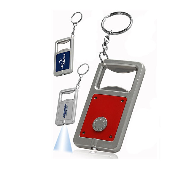 3 in 1 flashlight bottle opener keychain and LED gives out the white light. Ideal for family life and companies. LED powered by one cell battery. Unit price includes a one color imprint in one location.