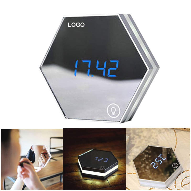 LED digital Alarm Clock with LCD displays month, date, hour and minute. Blue numbers will magically show up on the mirror surface. Place on the desk as a personal magic Beauty makeup Mirrors. It can be as a bedside night light, and LED lights with infinitely adjustable light, make your life easy and more convenient. The logo could be printed on the mirror.