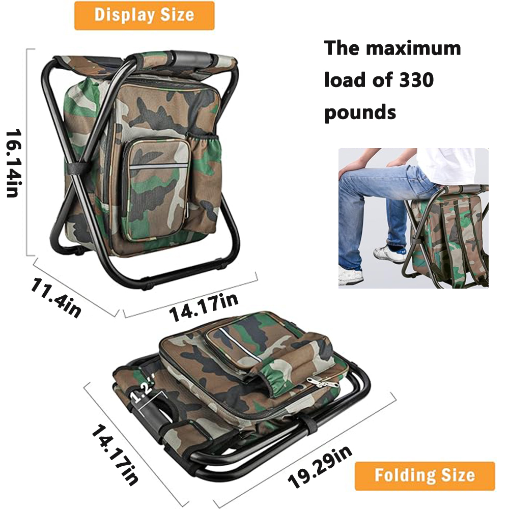 Folding Size: 14.17'' x 19.29''. The maximum load of 330 pounds. The Backpack has lightweight seat, breathable straps with wide shoulders for greater comfort. It can be folded totally when not in use and easy to carry. It folds up nicely to travel, pack, and store in the trunk of your car to take with you everywhere you need it. Professional and perfect equipment for camping, hiking, hunting, climbing, fishing, picnic and other outdoor activities.
