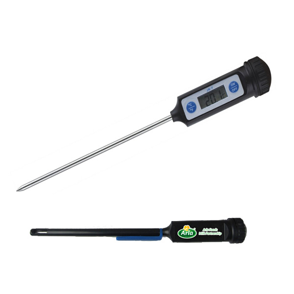 Digital BBQ Thermometer or food thermometer with waterproof function. Your great partner when go camping or picnic, suit to test the temperature of milk, bathtub water, experiment items and so on. Switch between F-Fahrenheit and C-Celsius. Temperature range (F: -58 to +572 or C: -50 to + 300). Memory of last measuring. Saving power: auto-off after 15 minutes of no-operation. Made from ABS and stainless steel. Size is 8.5"x0.78".