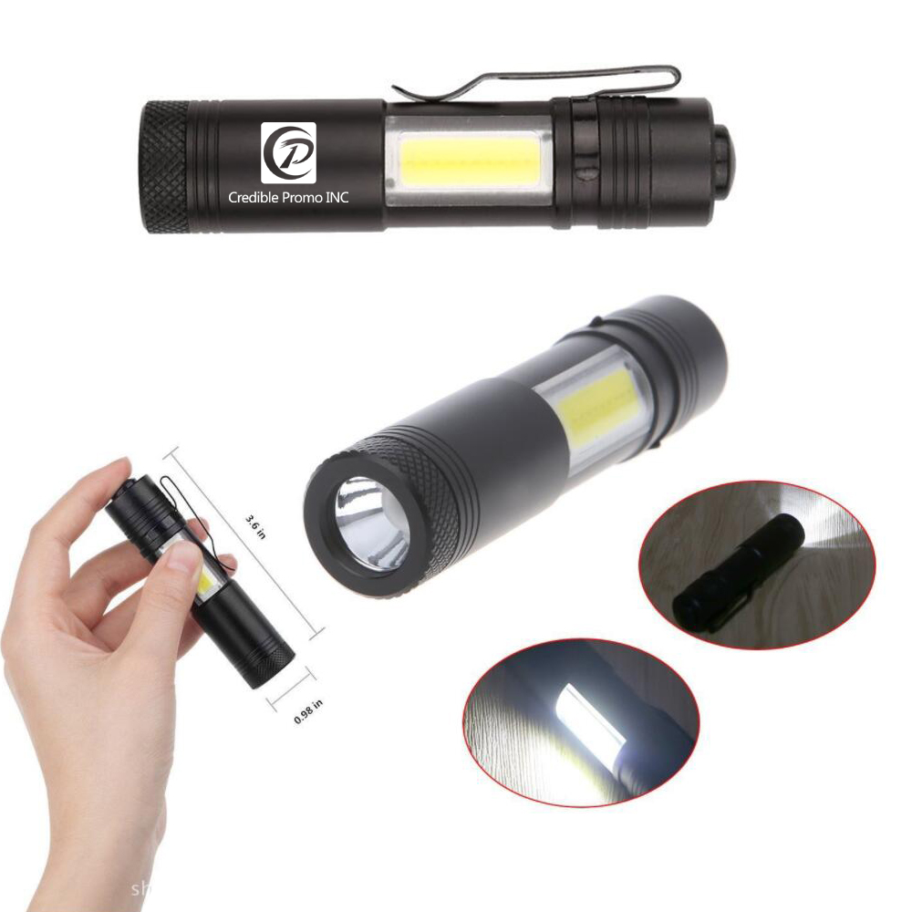 Catch this new generation hot sale mini flashlight now! Small and portable handheld flashlights enough to be fit in/clip on your pocket, handbag, belt. (3 1/2 inch L x 3/4 inch W). Ultra bright premium LED and COB bulb inside. 4 Modes brightness switched by button, high/low/COB work light/sos COB strobe. Powered by 1x AA battery(Included). Water Resistance ( IPX6 ) & Skid-proof design, can be used in rain but not intended for diving. Perfect handheld flashlights for use around house, dog walking, hunting, cycling, hiking, camping, fishing, emergency, vehicle, and other outdoor activities. Your logo can be laser engraved on permanently, inquiry us now!