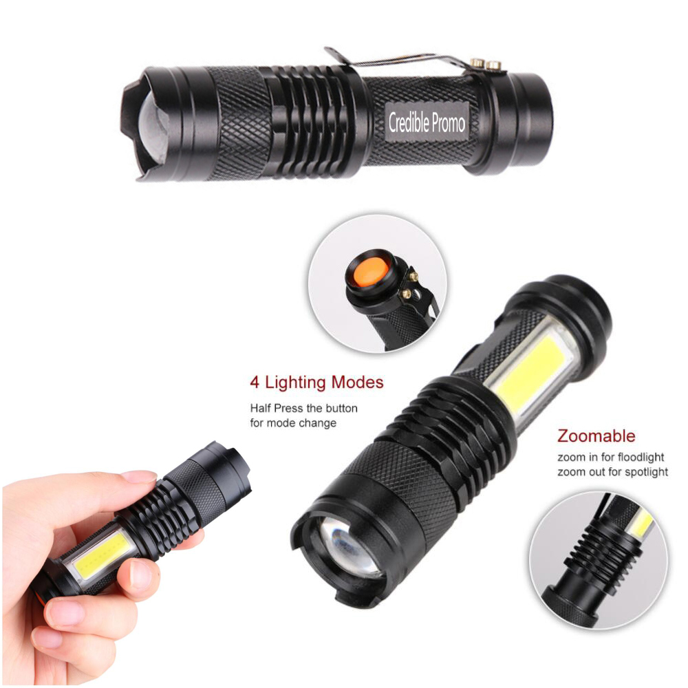 Catch this new generation hot sale mini flashlight now! Small and portable handheld flashlights enough to be fit in/clip on your pocket, handbag, belt. (3 3/4 inch L x 1 inch W). Ultra bright premium LED and COB bulb inside. 4 Modes brightness switched by button, high/low/side COB worklight/side sos COB strobe. Powered by 1x AA battery(Included). Zoomable focus beam design, adjustable focus torch light for long distance observation or large area illumination, stretches to adjust. Water Resistance ( IPX6 ) & Skid-proof design, can be used in rain but not intended for diving. Perfect handheld flashlights for use around house, dog walking, hunting, cycling, hiking, camping, fishing, emergency, vehicle, and other outdoor activities. Your logo can be laser engraved on permanently, inquiry us now!