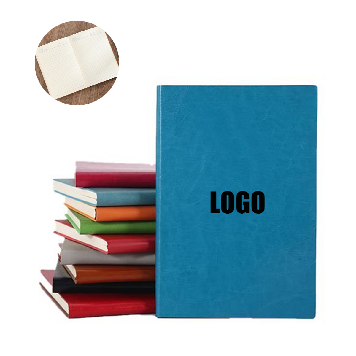 This journal is made with a imitation leather cover and perfect-bound pages. Features 100 sheets (200 pages) paper and a ribbon bookmark. Price includes a debossed imprint on the front cover.
