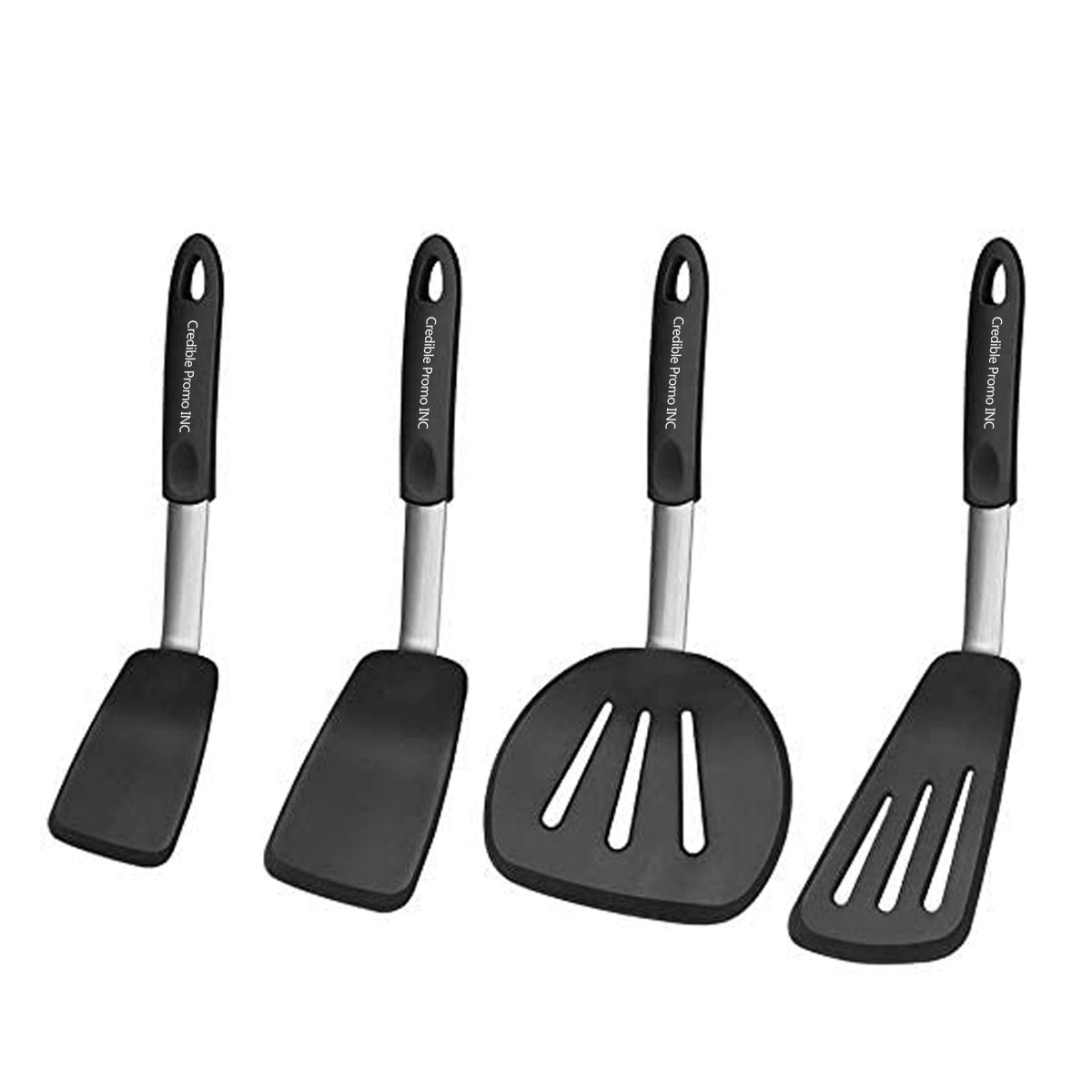 Set of 4 silicone spatulas is perfect for flipping eggs, pancake, fish, burgers, pizzas and dishes without breaking them. Made with stainless steel core and coated is high heat resistant set up to 600 degree F, and without worrying about warp or melt, or scratching cookware. Anti-slip TPR handle and dishwasher safe. Set Includes: 1* Medium Regular Spatula (11.8" x 3.07"), perfect for a regular daily cooking job. 1* Large Turner (13.1" x 3.9"), perfect for flipping eggs, burgers, crepes. 1* Extra Large Wide Slotted Spatula (12.4" x 5.9"), perfect for flipping large pancakes, omelet.1* Extra Large Long Slotted Turner (13.9" x 3.9"), perfect for flipping fish.