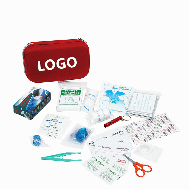 This First Aid Kit is small and easy to carry. You can deal with wounds soon to reduce and prevent wound infections when you are in emergency. It include: scissors, first aid blanket, elastic bandage, medical tape, alcohol slice, elastic cloth band patch, disinfectant wet towel, gauze hemostat, cold compress ice bag, aluminum alloy whistle, stainless steel saber card, self generating flashlight, scarf , silica gel tournique, safety pin, tweezers, methods of using English instructions, EVA bag. promotion gift for emergency product.
