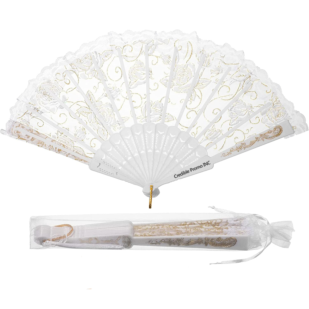 Our hand held fans for wedding are designed in white color and lace styles, decorated with gold rose and floral patterns, making you more elegant and eye catching in the crowd