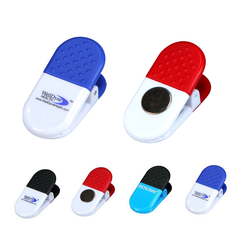 Magnetic Memo Clip Holder, made from PP and PS. Pill Shape. High intensity magnet with strong holding power. Great for papers, snack bags, memos and so on. Ideal promotional item with large exposure for your company message. Many colors for your option.