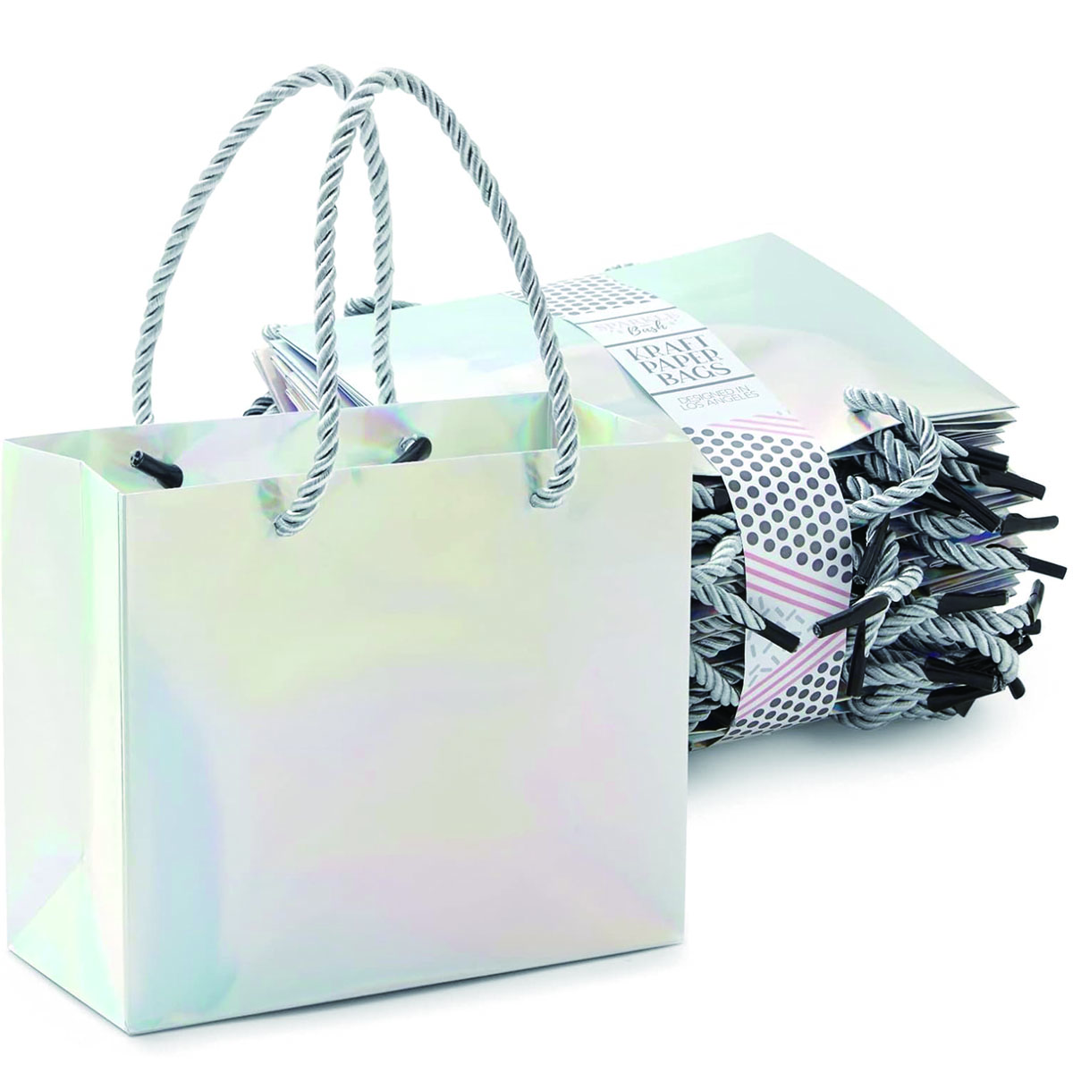 Our metallic silver gift bags with handles are a great wrapping solution for small gifts and presents or themed prizes and favors. The gift bags can be used at themed bridal showers, parties, graduation celebrations, holidays, or as bridesmaid gift bags at bachelorette-themed parties. The kraft gift bags are made from high-quality 100gsm white kraft paper with metallic foil film. The gift paper bags with handles each measure 6 x 5 x 2.5 inches, the handles offer grab and go convenience for guests as they enter or exit the party venue.