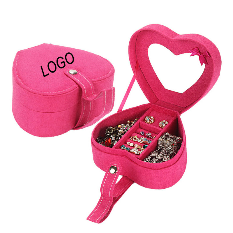 Mini jewelry box, made from velvet or suede fabric, with mirror inside. Size: 5.9x5.1x3.0". Heart shape design with a handle, multi compartments inside. Well collect your rings, necklaces, earrings, bracelets, etc. Your logo can be imprinted on the outside of box.