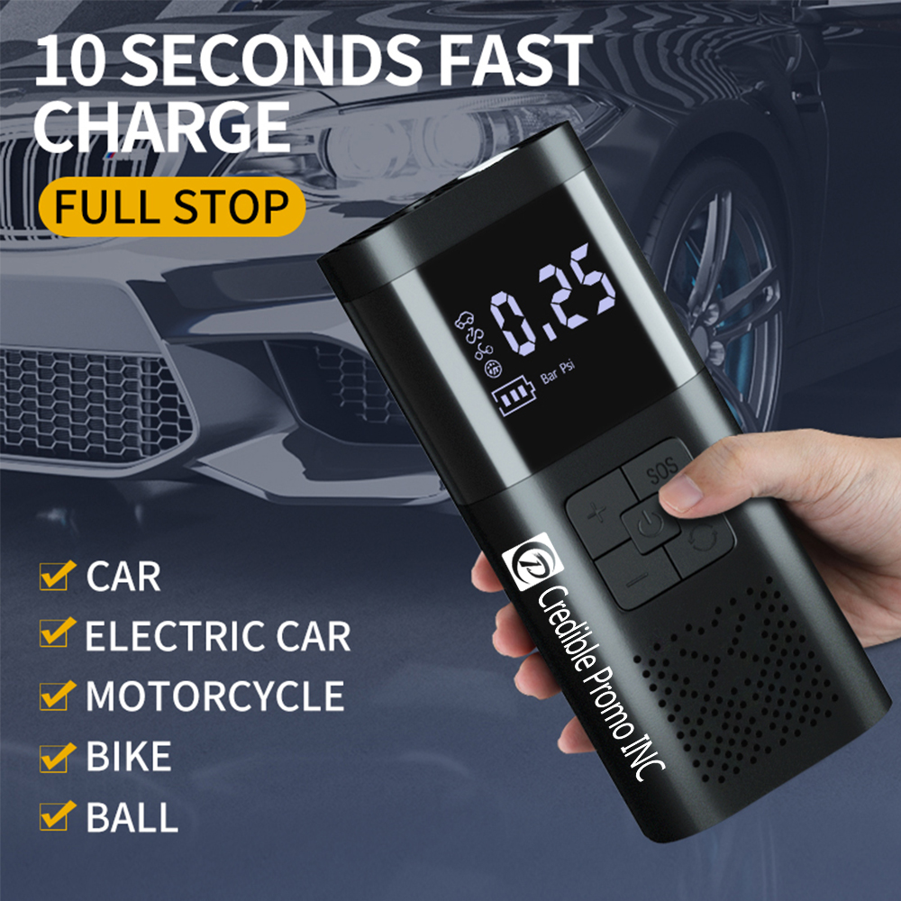 Our wireless rechargeable air pump is compatible with a variety of nozzles, suitable for a variety of items to inflate, like pro-bike tires, home use car tires, motorcycle tires, electric bicycle tires, balls, swimming rings, inflatable toys and other inflatables. It can not only work as a tire inflator but also as a LED flashlight, or a power bank. With an LCD screen to show & preset tire pressure and working modes, a built-in 6000 mAh battery for your cable-free operation, and auto shut-off for your smart use. Cigarette lighter cable to use in case the battery is run out.