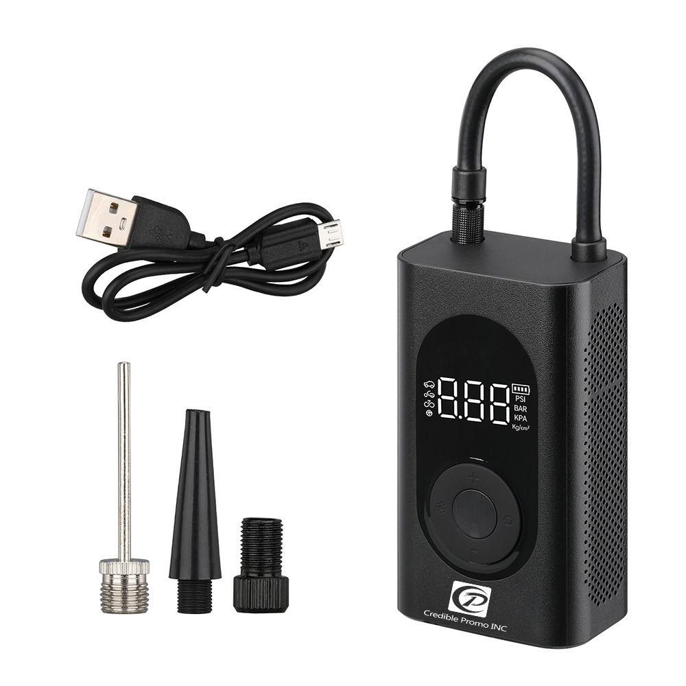 This mini portable wireless rechargeable air pump is compatible with a variety of nozzles, suitable for a variety of items to inflate, like pro-bike tires, home use car tires, motorcycle tires, electric bicycle tires, balls, swimming rings, inflatable toys and other inflatables. It can not only work as a tire inflator but also as a LED flashlight, or a power bank. With an LCD screen to show & preset tire pressure and working modes, a built-in 2000 mAh battery for your cable-free operation, and auto shut-off for your smart use. Cigarette lighter cable to use in case the battery is run out.