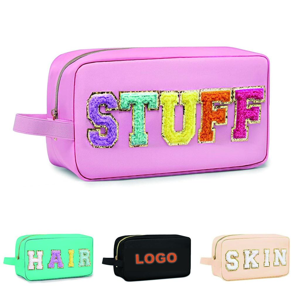 This nylon bag organizer comes with a handle aside, suitable for carrying to go everywhere without dropping. It is protable for travel, outdoors. This cosmetic bag uses a minimalist design to show its fashionable and elegant atmosphere. You can also custom chenille letter logo, but it is better no more than 5 letters.