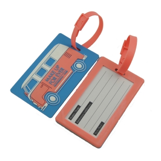 Custom soft PVC luggage tag, size is 4.1"x2.5". With a name paper card inside. Buckle it on the luggage's handle with strap. Your customized artwork can be 2D imprinted. Make your company LOGO outstanding with this useful, colorful, and attractive promotional product.