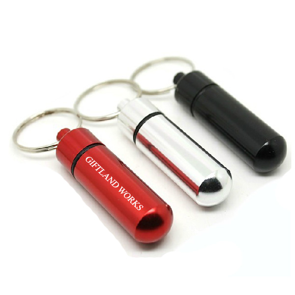Metal Pillbox with Keychain, watertight, made from Aluminum Alloy. Size is 2"x1/2". Your best choice when you go out with pills. This pill box works very well in water parks, fishing trips, bike riding and camping. Your LOGO can be imprinted on or laser engraved.