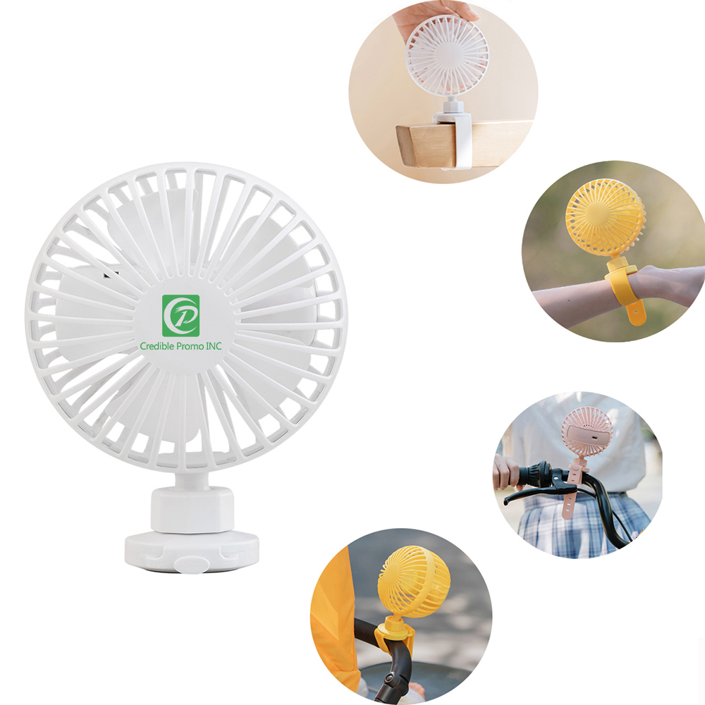 This portable fan is made of durable ABS and PP, with silicone wrist band. The mini fan has a built-in 2000 mAh rechargeable battery, charging time is about 4 hours. Working time is about 2.5-7.5 hours depending on different speed. USB charging via a computer, laptop, mobile power, USB charger, mobile phone adapter, car charger, etc. Very convenient, you can charge it almost anywhere. You can fix it on baby stroller, desk, bike, bed...anywhere you need through the wrist band. Custom logo is welcomed