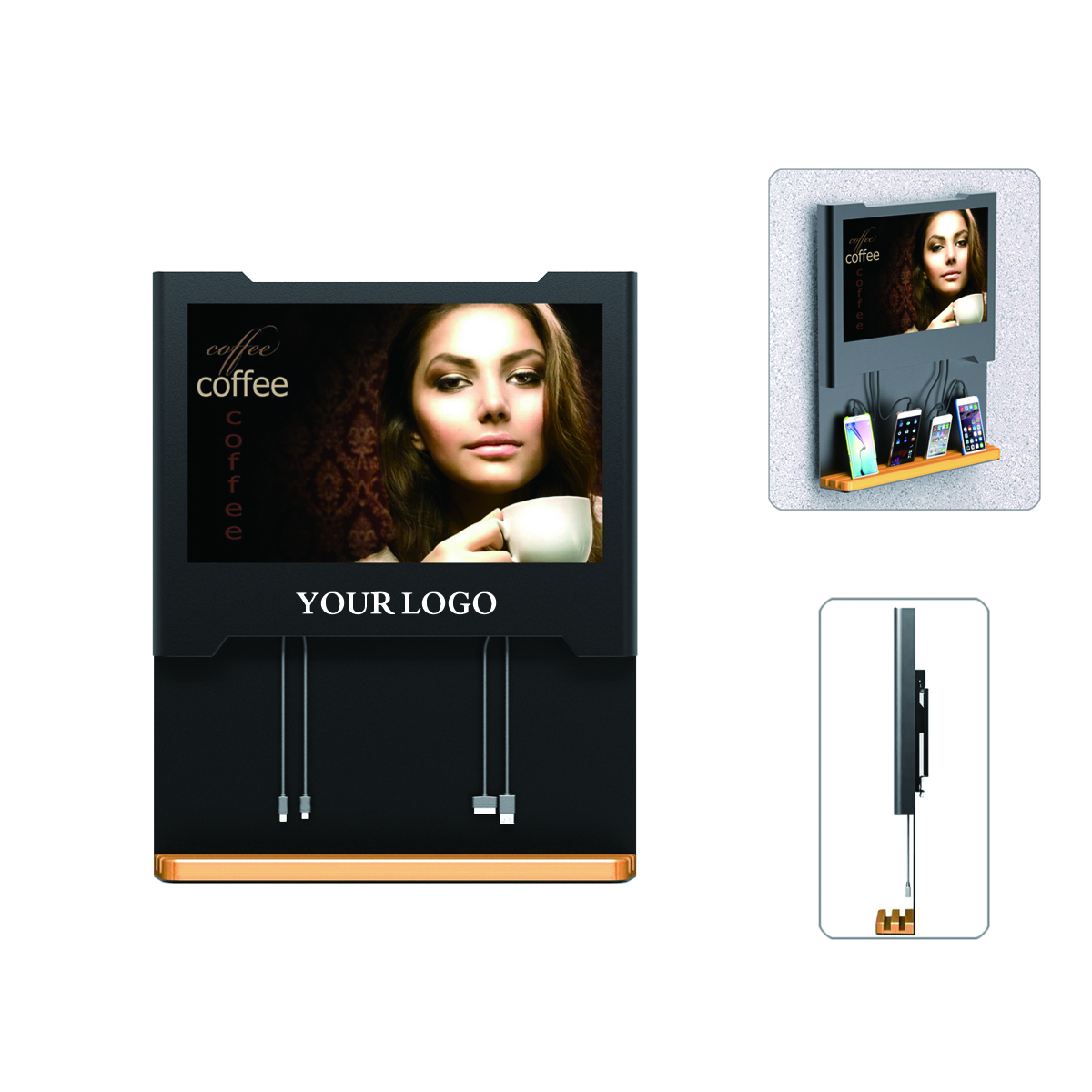 Commercial advertising display charging station, advertise your brand. Ideal for cafes, coffee tables, waiting rooms, restaurants, hotel lobbies, reception areas, office spaces, lounge rooms and more. Size is 480(L)*600(W)*42(H)mm. Output 1-4Ports: DC5V/2.4A(MAX) &Input voltage: AC 100-230(V). 1pc charging station+1pc AC Wire+1pc 15V 6A adaptor+4pcs plugs. 19'' Led Screen. The cables can be replaced with the interface you specify. Our listed price over 50 pcs includes shipping cost by sea, leadtime is around 45 calendar days.