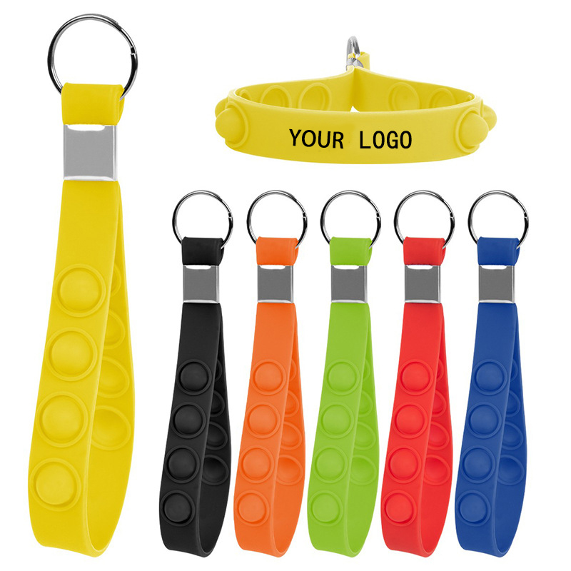 Made Of Silicone. A brand name, logo or message using superior zenith silk screen printing. Press bubbles down to relieve stress. Encourages focus and self-soothing for users with anxiety, attention disorders and more. Fun stress reliever. Make your own pattern by pressing on different bubbles or just press for fun. Perfect for reducing stress and boredom. Split ring attachment.