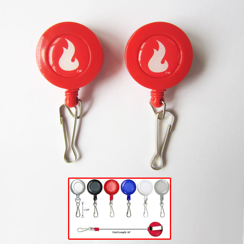 Retractable badge reel with a 24" cord extension. Made from plastic. You can put this badge reel on your pocket with a metal clip on the backside. Your LOGO can be silkscreen imprinted or epoxy printed. Great item for exhibition, conference, party and other business activities.