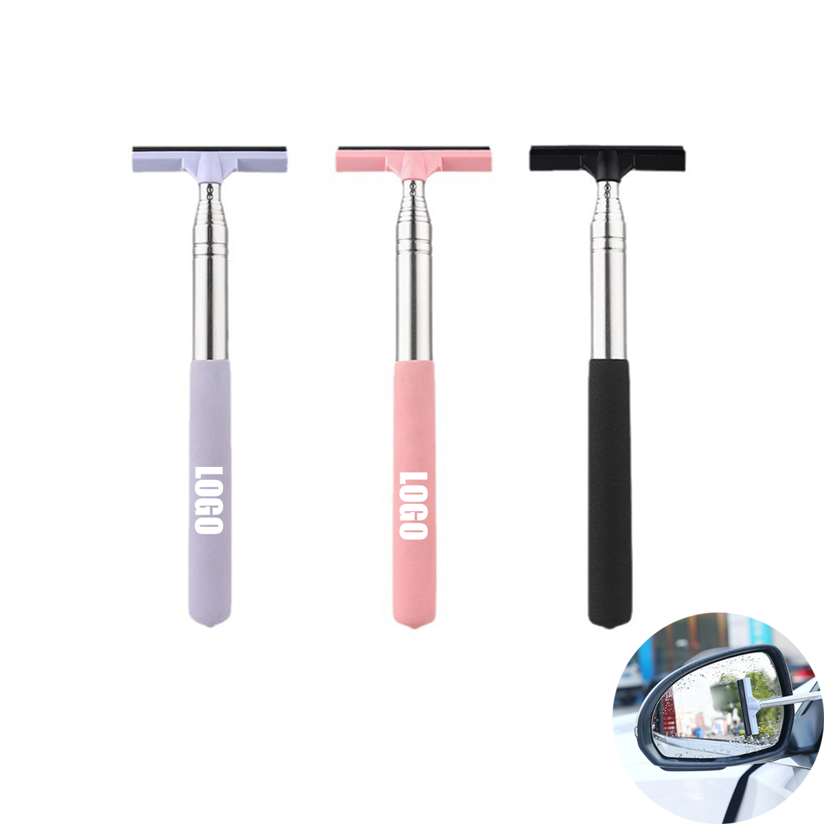 This car mirror wiper head is made of high quality natural rubber material which is soft and ensures that it will not scratch or damage your mirror. The handle is wrapped with soft sponge for easy and comfortable use. The telescopic lever is made of sturdy stainless steel and will not rust. Designed with a layered brush head, simple and practical, wipes water quickly, easy and convenient to operate, can quickly and easily remove rain, dust, fog on car rearview mirrors.