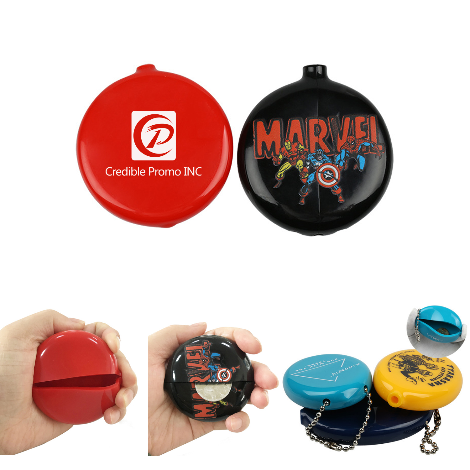 This squeeze coin purse has a beaded chain key ring to attach your keys. Easily squeeze the ends of the coin purse and insert or remove your change. Great for keeping your coins in your pocket and not falling out. Pantone and logo are available.