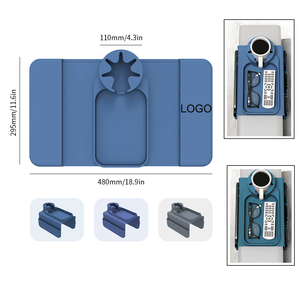 This universal side couch tray has upgraded size fits sofa armrests over 6 inches. Please measure the width of your sofa armrest before buying to make sure it fits this size. This spill proof couch caddy made with food-grade silicone material rugged and sturdy. Convenient arm rest table for couch with side pockets for easy storage of remote controls, phones, ipad, magazines, keys, glasses, and more.