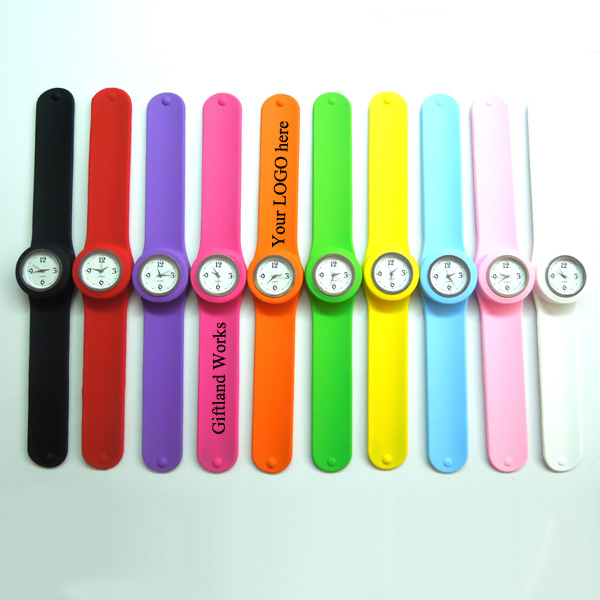 This fashionable silicone slap watch can comfortably fit any wrist. Size is 11"x1.3". High flexibility and non toxic. Many colors and your customized LOGO is available.